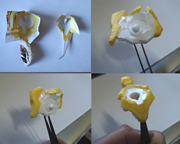 他の3枚はテープを三角やカーブしていろいろな形に切って、パーツの起伏に