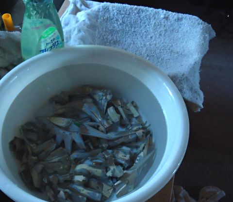 ふきんをしいた箱を用意して、家庭用洗剤で磨いて水洗いしていきます。