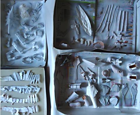 ホワイトサーフェイサー乾燥後、全パーツ紙やすりで磨き、粉だらけの