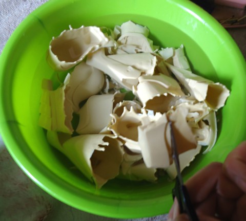できれば温めて切ります。上の写真の洗面器の中は、切れた