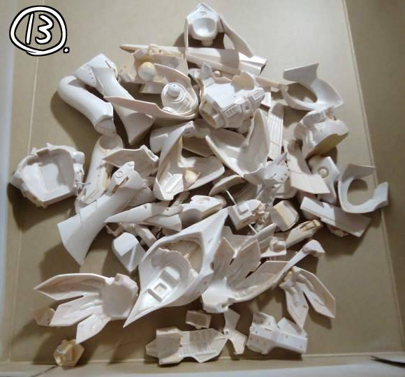 9、10:キャスト片をパーツのカケに接着して削り合わせた所。白い