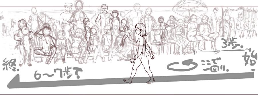 試作を描きます。まず超横に長い背景を描く。「歩行」は、実際の