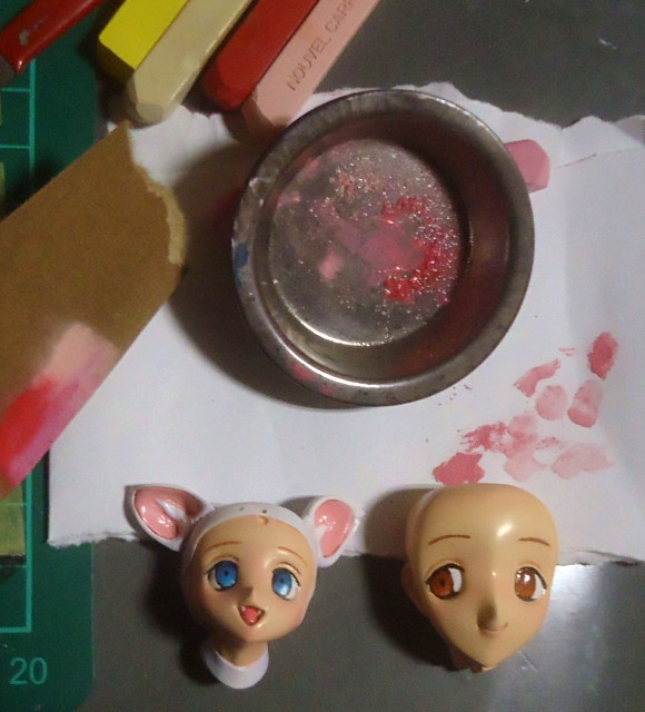 紙やすりでけずって塗料皿にエナメル溶剤でうすめて、さらさら粒子を